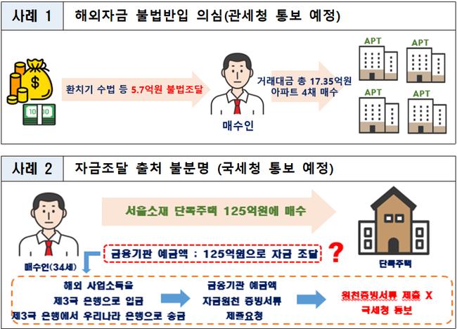 이번 조사에서는 고가 주택을 매수하면서 외화 반입 신고 없이 현금을 들여오거나, 제3국 금융기관을 거쳐 자금을 우회 송금한 뒤 국내 고액 주택을 매입한 의심 사례, 방문취업(H2) 비자로 체류하면서 임대보증금을 승계해 임대 수익을 올린 사례, 법인이나 부모 등 특수관계인이 대규모 자금을 빌려준 뒤 차용증과 이자 지급 내역이 불명확한 편법증여 의심 사례 등이 다수 확인됐다.