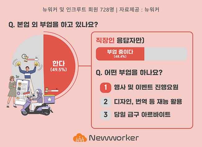 기업 주문형 긱워커 플랫폼 뉴워커가 11월 1일부터 16일까지 728명을 대상으로 실시한 설문에서 직장인의 48.4%가 부업을 하고 있다고 답하며 부업 선택의 최우선 기준으로 `시간`을 꼽은 것으로 나타났다.