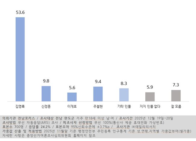 2026년 제9회 더불어민주당 전남도지사 후보 지지도 조사에서 김영록 현 전남도지사가 53.6%의 지지를 얻어 과반을 넘기며 압도적 1위를 기록한 것으로 나타났다.